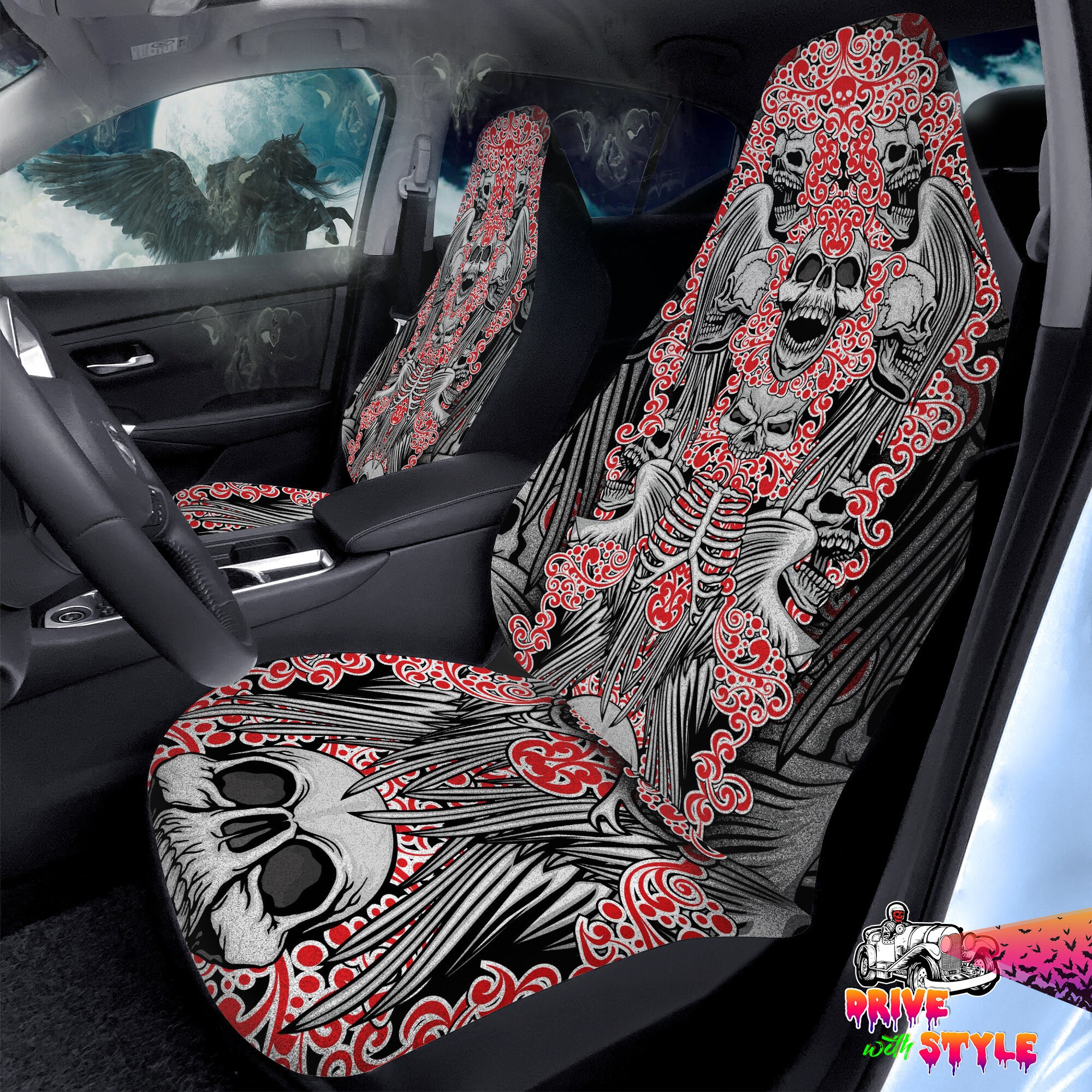 Vintage Skulls And Angel Wings Bats Car Seat Covers Grunge Gothic Car Seats Protector Goth Car Accessories Occult And Heavy Metal Car Etsy